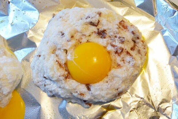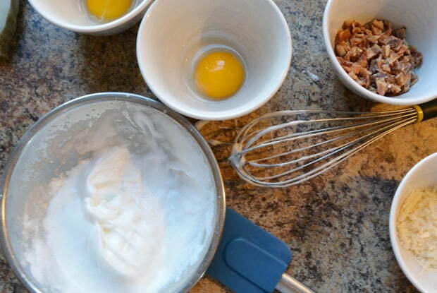 - Separate your eggs, whites in one bowl, and the two yokes in separate bowls. Whisk whites to firm peeks either by hand or with a mixer. With a spatula, gently fold the bacon and cheese into your whites, so as not to deflate the meringue. Divide whites into equal mounds on a baking sheet, create a little hollow in the center to later receive the yoke.
