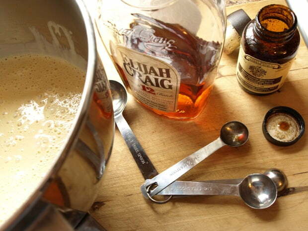 3. Chill your bourbon custard in fridge or in an ice water bath until cold, then strain into a) your ice cream maker and follow the manufacturer’s instructions or b) a chilled freezable bowl or container. If you have a stand mixer, use your mixing bowl so you can easily work the ice cream moving forward.