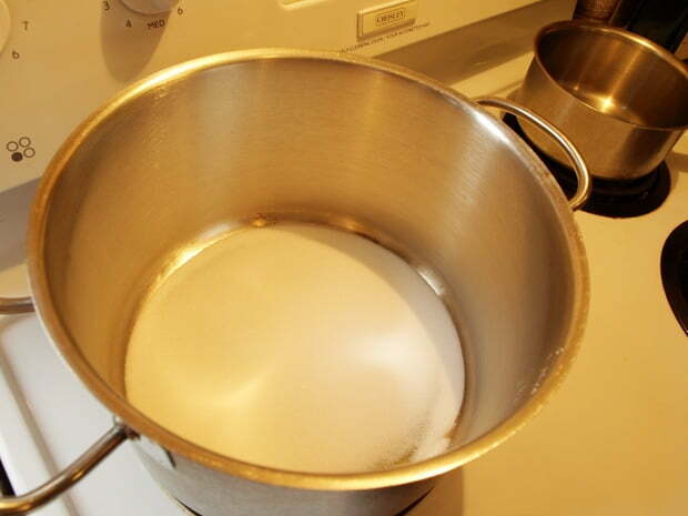 2. Heat your sugar in a well dried, wide pot with a heavy bottom over medium heat. Stir lightly with a wooden spoon to distribute sugar evenly until it starts to melt. Then remove your spoon and cook sugar, swirling the pot occasionally to get even heat and colour to your sugar as it begins to caramelize to a deep golden, rich colour.