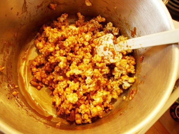 3. Remove from heat, add butter, pecans and vinegar and stir quickly to combine into a sticky caramel. Immediately add popcorn and stir to coat, then pour out your caramel covered popcorn into the waiting oiled dish to cool and sprinkle with coarse salt. Once cool enough to handle you can rip it apart with your fingers for small bite sized pieces or, wail until completely cool and cut or break your praline popcorn into squares.