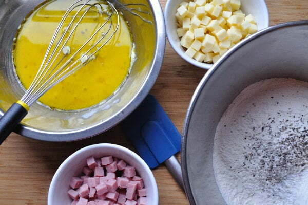 - In a separate bowl whisk eggs, milk and melted butter (or olive oil). Fold the wet ingredients into the dry with a spatula until barley mixed. Fold in ham and cheese in the same manner. Just three or four tuns of the spatula, being careful not to over mix.