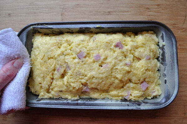 I’ve often made this recipe as an Upside-down Savoury Ham & Cheese Loaf with the ham and cheese loaded, or marbled, on the bottom. A little savory loaf twist. Try it for fun. Here’s how:
