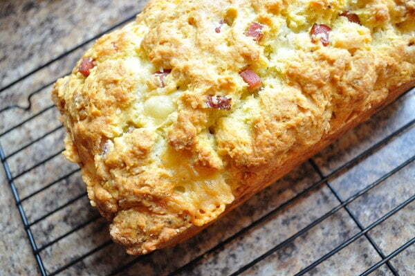 Separate half the ham and cheese, add half of each to the dough, once mixed as noted below. Put about a half inch layer of dough in the bottom of your prepared loaf pan, spread it out with a spatula or your finger tips. Layer remaining ham and cheese on top of the dough, add remaining dough on top and bake as directed. The result is a gooey, crispy ham and cheese-y bottom/marbled streak.