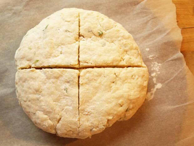 1. Add dry ingredients – flour, baking soda, kosher salt, granulated sugar to a large bowl and whisk to combine. Add cheese and green onions and toss together until well blended. In a separate bowl lightly mix buttermilk and egg together. Form a well in the dry ingredients (plus cheese etc) and add milk & egg mixture. Mix with a wooden spoon or spatula, just until dough comes together. This will be a lumpy, course dough unlike yeasted doughs, which are smooth and stretchy.