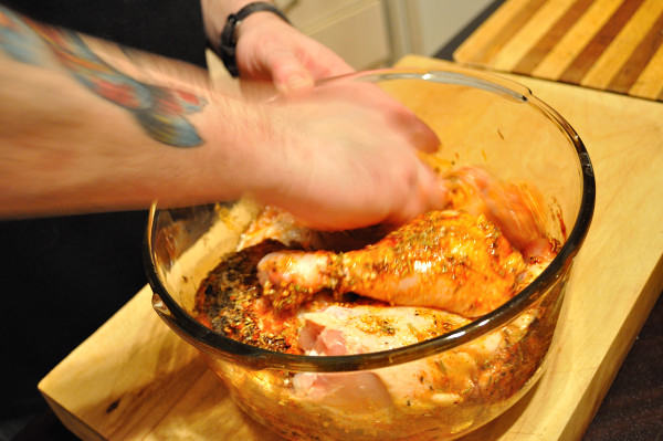 1. Add oil, half of your garlic and thyme, all of your rosemary, smoked paprika, salt and pepper (to your indiscretion) to a large, shallow bowl and mix to combine to a paste. Add chicken and toss, by hand, rubbing spice paste into and (where possible), under skin. Allow to stand and marinade for 20 minutes, at room temperature.