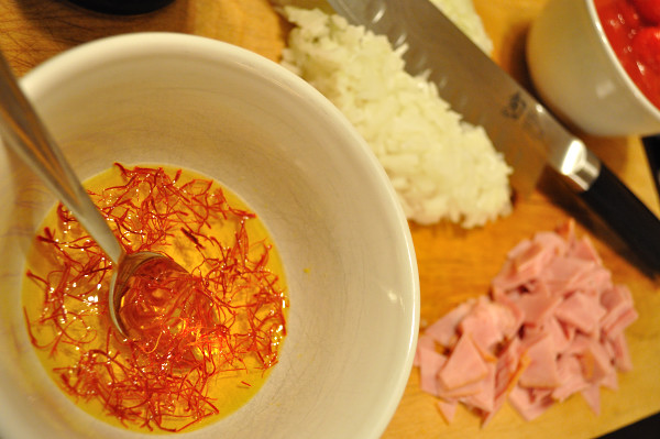 2. Place saffron in a small heat-proof small bowl, add boiling water, stir to begin to release flavour and colour and and reserve.