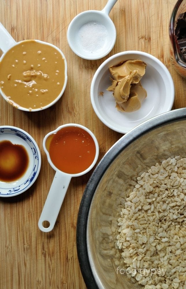 Brutally easy, it’s just six ingredients – crispy rice cereal, peanut butter, honey, vanilla, salt and chocolate. Requiring only basic kitchen tools; measuring cups, measuring spoons, wooden spoon, spatula, bowl, microwavable vessel for melting the chocolate and an 8 x 8 pan. Pretty manageable stuff.