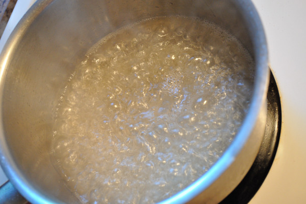 3. Prepare a water bath, if you want, you can place a towel in the bottom of large baking dish, to keep dishes from sliding.  Place ramekins in the the pan filling with COLD water,  to just over halfway up the sides of the ramekin.  In a saucepan, over medium-high heat, add the remaining 1/2 cup of sugar and the water, allowing it to bubble until it is a deep, amber brown colour.  Divide hot, stiff sugar into eight half cup (125 ml) ramekins or oven-safe dishes, standing in the waiting bain marie.