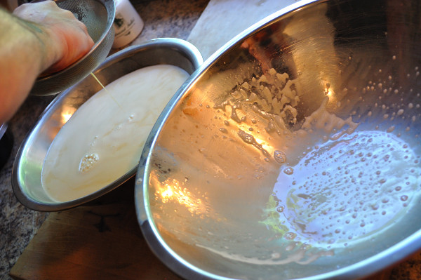4.  Divide a potion of the hot milk mixture into the pot used for the caramel, and place over medium heat.  Stir to dissolve the caramel on the bottom of the pot into the milk, about 3 minutes, then pour back to the pot with the milk and gently stir.  Add the hot milk to cold eggs  slowly in thirds, stirring back and forth to combine, but not froth, the mixture.  Once combined, pour through a sieve into a waiting bowl to strain out the zest and cinnamon stick, then give the zest a little squeeze to get all those warm oils into the custard and relaese the citrus fragrance.