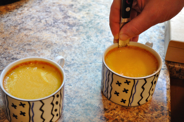 Créme Caramel is like a woman, she likes things a certain way.  Give her what she needs things will be smooth and sweet, cross her and you pay the price.  Her needs are simple: a nice cold bath, care taken wither her sugary bottom, and NO whisking.  (Save the whisk for chocolate mousse, she loves a good whisking.)  As he stirred and mixed, ever so gently, I discovered how many questionable versions of this classic I’ve had.