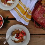A country classic loaded with fruit and topped with a crisp, crumbly topping; this Rhubarb Crisp recipe will never let you down. Serve warm topped with whipped cream, ice cream or plain yogurt and fresh strawberries for a true taste of summer.