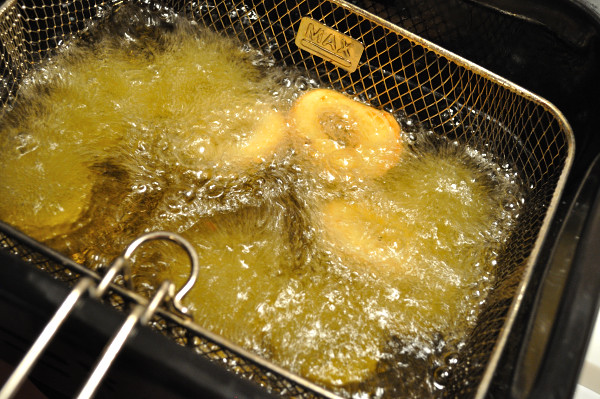 6)  Line a tray or baking sheet large enough to hold the doughnuts with paper towels before frying.  If you are frying on the stove top, you will need about three inches of oil in a deep, heavy pot over medium-high heat.   We recommend using a thermometer and heating to  350*F.  Place up to six mini-doughnuts in the hot oil at a time, being careful not to crowd the pot. Fry on each side for 2 to 3 minutes, or until golden brown.  Using a slotted spoon, fish them your piping hot doughnuts onto the prepared tray to drain and cool.