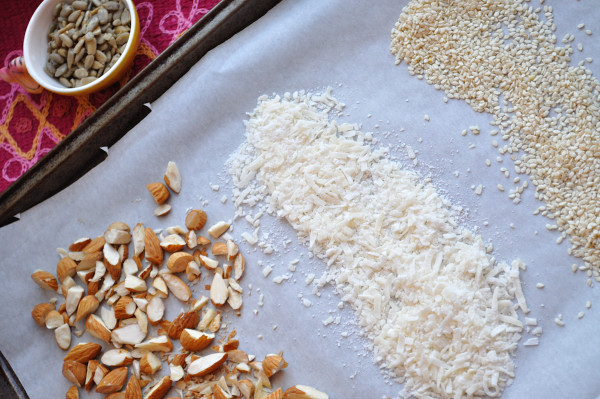 - Preheat the oven to 325⁰F (160⁰C) and line two cookie sheets with parchment paper or a silpat mat. On one parchment lined cookie sheet, toast almonds, sesame seeds, coconut & sunflower seeds in the pre-heated oven for about 5 minutes, watch for coconut to be lightly brown. (Toasting is not imperative, but it gives the cookie some added crunch, and yumminess.)