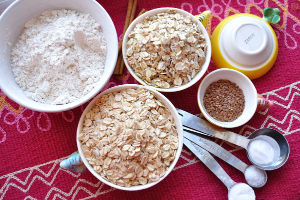 - In a medium bowl blend together spelt flour, oats, barley, flax, baking soda, baking powder & cinnamon with a spoon or spatula.