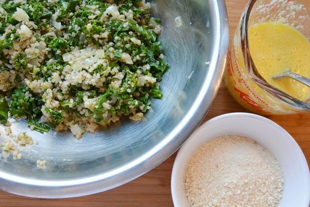 2. Lightly beat eggs with Parmesan, chives and salt in medium mixing bowl. Add egg/cheese mixture to kale and quinoa, then bind with breadcrumbs and stir to combine. Form patties using a half cup of the wet mix, then chill in freezer for 8 – 10 minutes to firm patties.