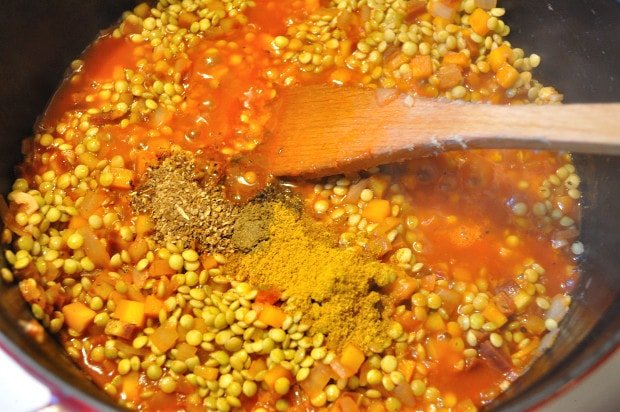 3. Add tomato paste to vegetables and stir to coat, add soaked lentils and half of the vegetable stock, stir to combine. Add salt, pepper, garam marsala, curry, cumin, thyme & chilies and stir and cook for about fifteen minutes, adding stock as needed until lentils are tender and stew is to a nice, juicy consistency.   Add coriander at the very end, off heat, this will keep it fresh and green while still adding brightness.