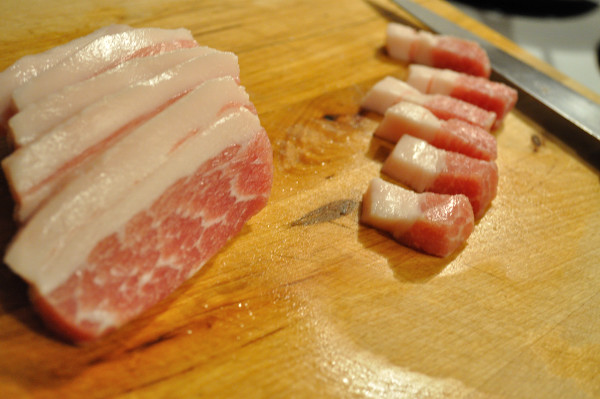 - In a large, deep sauté pan, sauté lardons over medium heat until golden brown then remove, drain, and de-grease the pan. Reserve cooked salt pork cubes at room temperature. Do not rinse your pan, that golden colour on the bottom of the pan is FLAVOUR. (If you want, you can use the pork fat instead of butter, but it’s mighty salty.)