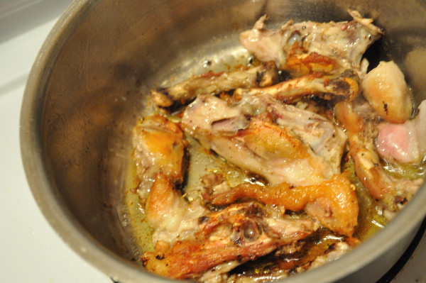 - In the traditional method, each piece of chicken contains only one bone. To achieve this, remove first the back and then the thigh bone; cutting them away cleanly to the top of the leg joint. (This will help accelerate your cooking time and make it easier to eat.) Fold over the skin and flesh of thigh to form a neat package (you can tie it if you want) and reserve. In a small pot, add one tablespoon of olive oil, over medium heat, until liquid and hot and then add remaining bones (thigh, back and any extra bits) and brown well before turning (about 6 minutes/side). This is a brown stock recipe, be sure to get lots of colour on those bones.