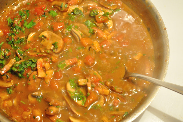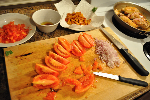 Then you have a beautiful meal in about an hour. You will sacrifice a bit of taste but you can make up for it by simmering 2 cups of chicken stock with the leftover bits of mushrooms, and tomatoes to reduce by half (like we do in step 3).