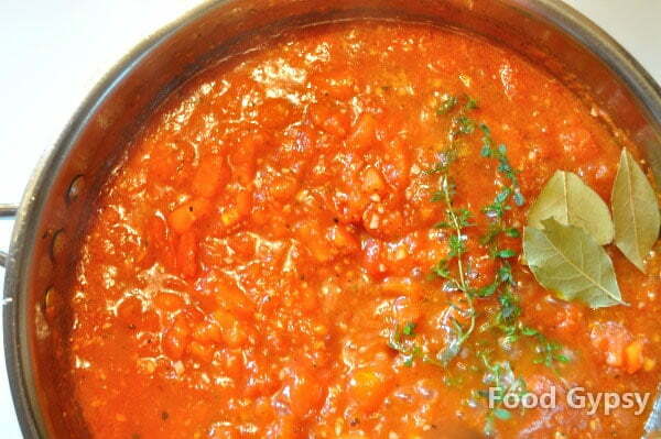2. In the same pan, add more olive oil as needed and start sweating your onions until transparent, stirring as needed (about 4 minutes). Add finely chopped garlic and parsley and cook for a minute or two more before adding diced roma tomatoes and cooking for about three minutes. Finally, add your canned tomatoes, crushing them by hand as you add them to the pan. Season and stir. Reduce heat to medium-low to simmer for about 10 minutes to reduce by half, stirring as needed.