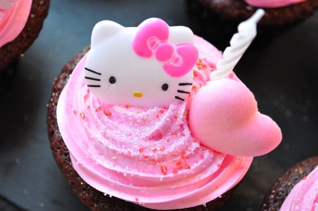 It’s birthday season once again at Chez Gypsy. We begin with the Junior Miss and her fourth birthday celebration, and what better way to say “happy birthday” than with Red Velvet Hello Kitty Cupcakes.