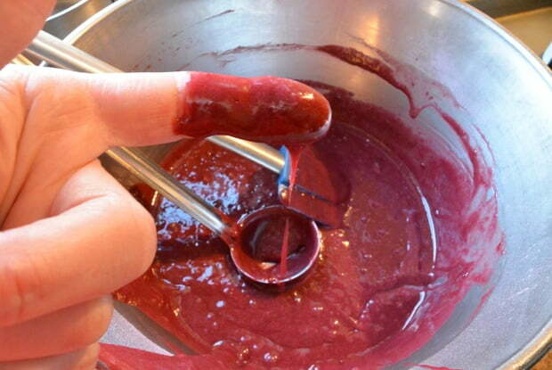 2. In a medium bowl, beat eggs, buttermilk, butter, vanilla, and vinegar until well-combined. Add red food colouring (go a couple of shades darker to get the colour you want, it will lighten when you add the dry ingredients. Adjust as needed.) Pour the wet mix into dry ingredients and fold gently until combined. Do not over mix. Treat the batter with care.
