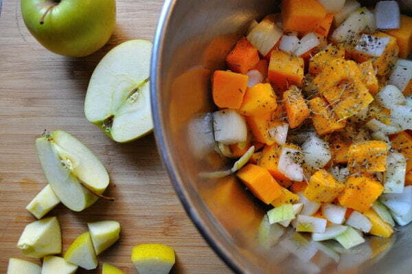 - In a large bowl combine pumpkin, onions & apples. Toss and coat with olive oil, rosemary, thyme, salt & pepper then spread evenly on a baking sheet sprayed well with non-stick spray. Roast in pre-heated 400°F (220°C) oven for 30 – 45 minutes, turning the roasting mixture halfway to brown more evenly.