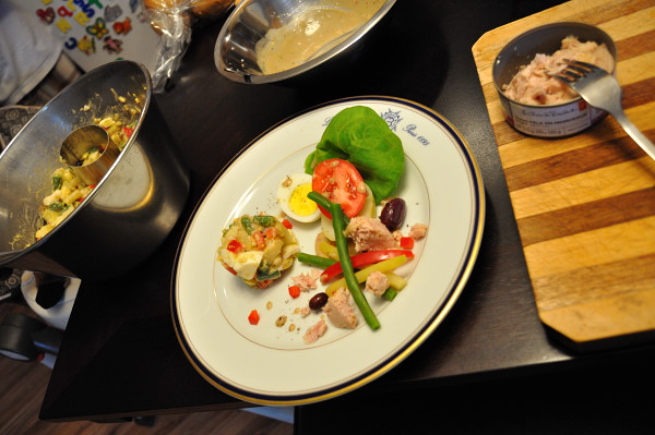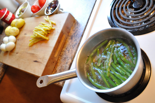 We join JC100 in progress, with weekly recipes based on Julia’s published works. We’re picking up at week 4 with Salade Nicoise because neither of us are overly fond of week 5’s recipe, Vichyssoise, a cold leek and potato soup, and hey, someone’s gotta’ eat this stuff. This is not my first Salade Nicoise, but this time I was not timed or graded, as I was the first time in Basic Cuisine at Le Cordon Bleu, Ottawa.