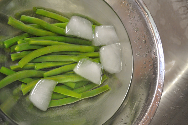 Cook green & yellow beans in large post of salted, boiling water until bright in colour and slightly soft. Remove immediately from heat, shock in cold water and chill. Reserve cold.
