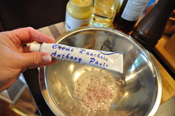 In a separate bowl add shallots, mustard, red wine vinegar, anchovy paste and seasoning. Whisk lightly. Slowly add oil, drizzling a little at a time, whisking to blend and emulsify into a smooth, cohesive dressing.