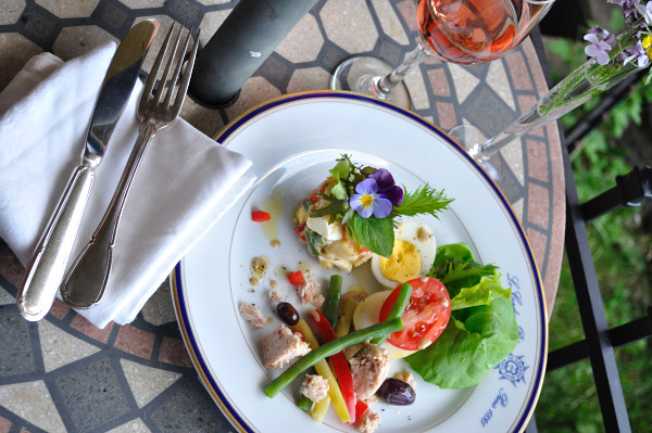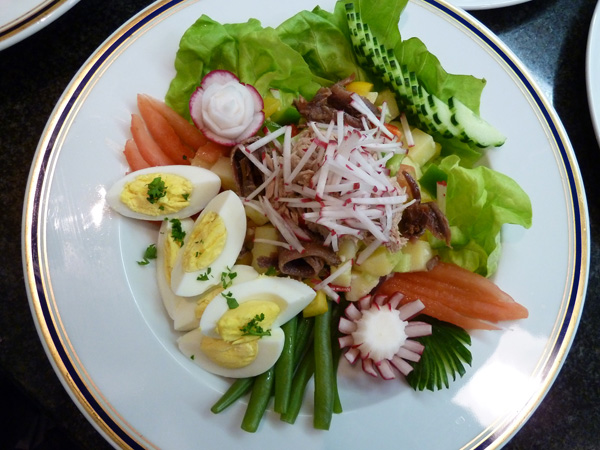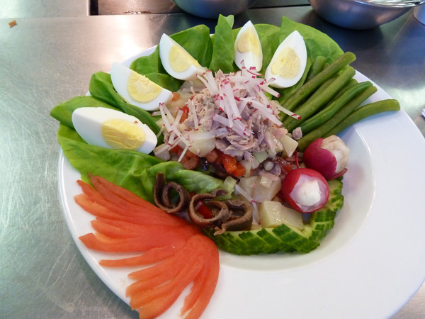 A simple cold salad, from Nice in the South of Prance, Salade Nicoise is a meal for the hot days of summer. Cold, boiled potatoes, hard boiled eggs, cold cooked beans, fresh peppers, radishes, tomatoes & red onion, black olives, anchovies and tuna all served with a light vinaigrette on a bed of soft leaved lettuce.