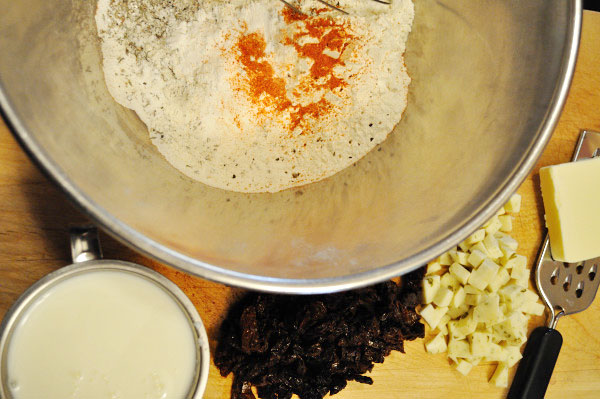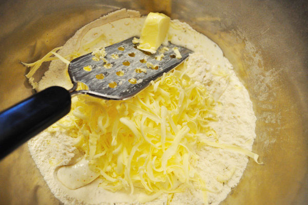 3. Combine flour, cheese, thyme, rosemary, oregano, baking powder, baking soda, salt and caynne pepper in a bowl, and stir to combine. Grate cold (or frozen) butter into to dry ingredients, combine with fingers or a spoon, until your mixture resembles coarse a meal. Stir in chopped tomatoes and add buttermilk, stirring just until moist.