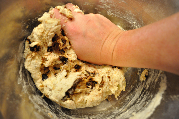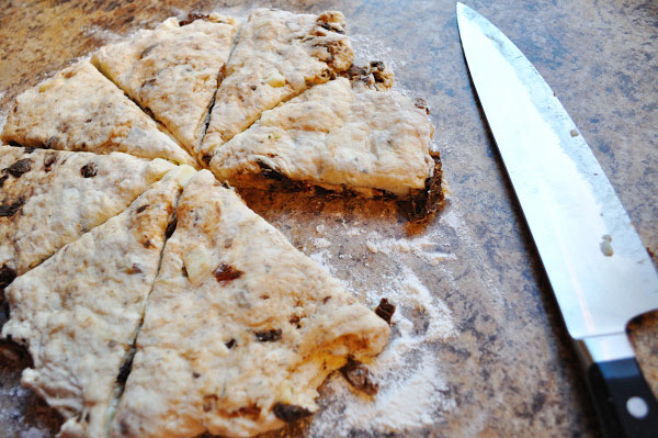 4. Turn (sticky) dough out onto a lightly floured surface; knead lightly three or four times with floured hands to form a cohesive dough. Pat dough into a circle (about a 1/2 inch thick) and cut circle into eight to twelve wedges. Place wedges onto your prepared baking sheet, spaced about an inch apart.