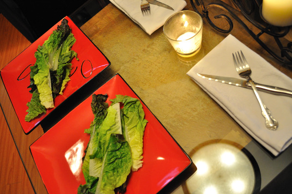 The now cool, dry, half-cooked potatoes get tossed into the waiting, hot duck fat, seasoned and the pan returned to the 425* oven for about 10 minutes. Chef B turns to the plates, now set on the table and lays a bed of dry Romain leaves across and grabs he new favorite sun-dried tomato vinaigrette.
