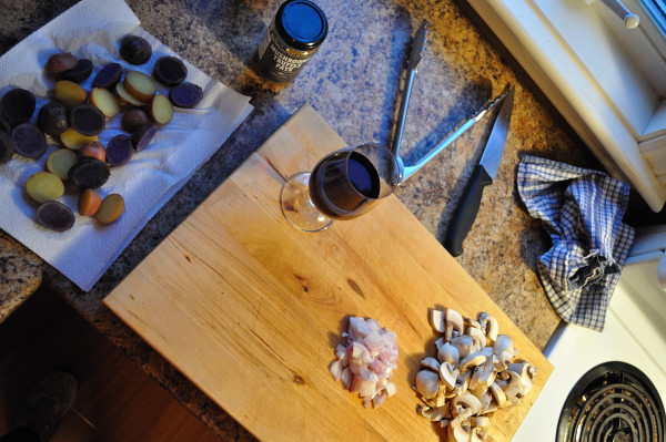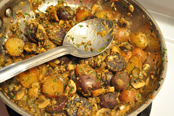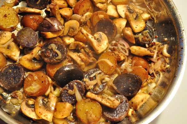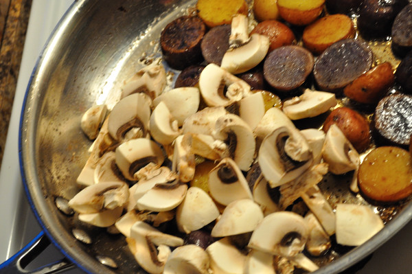 The potatoes emerge from the oven, a generous portion of the clear duck fat is removed and then the pan in returned to the top of the stove on medium heat and in go the mushrooms for a toss and a sizzle.