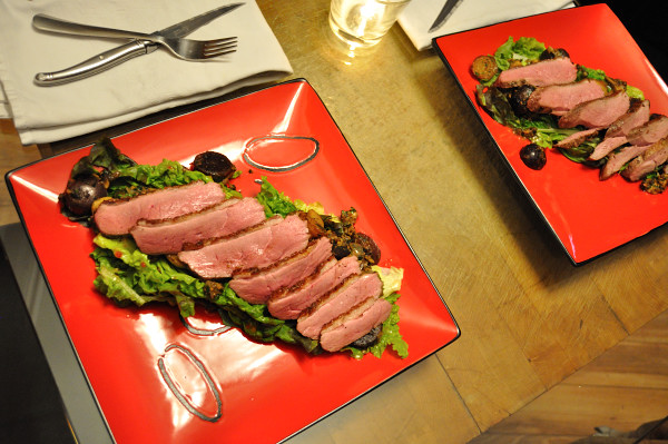 The duck is removed from the oven to the cutting board, where it’s sliced. He drizzles a touch of the tomato vinaigrette on the waiting lettuce and spoons the loose, fragrant truffled potatoes and mushrooms over top, then tops the whole works with the warm, rare duck. Voila, Seared Duck Breast, Truffled Potatoes & Mushrooms — the combination is cold and hot, earthy and savory, tangy and slightly gamy.
