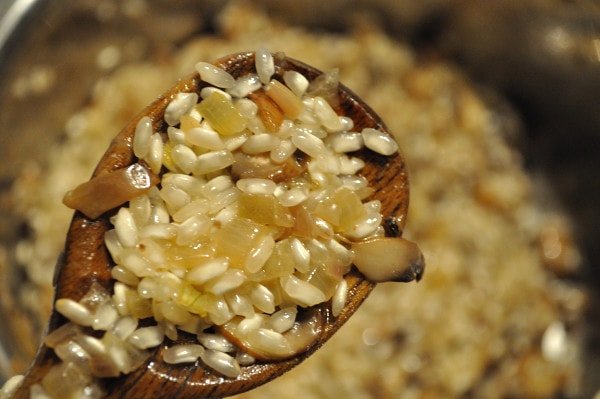 - Add half olive oil and remaining butter to the cooked mushrooms and melt over medium heat. Add rice and stir, coating rice well with fat, turning and cooking for 5 or 6 minutes until the outside of the rice kernel is transparent. (see photo, above)