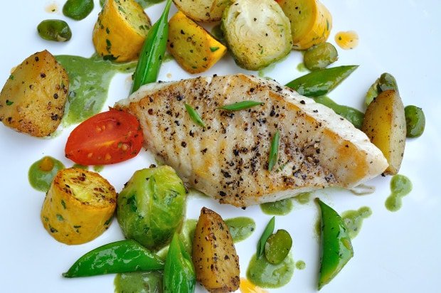 2. Divide oil in two large pans over medium high heat; add zucchini, potatoes & brussel spouts to one and fish to the other when oil comes to just under the smoking point. Sear fish, about two and a half minutes on each side. As fish cooks, toss veggies with oil, season with salt & pepper then add sugar peas to veg pan as fish finishes and you remove it from the pan to reserve, warm.
