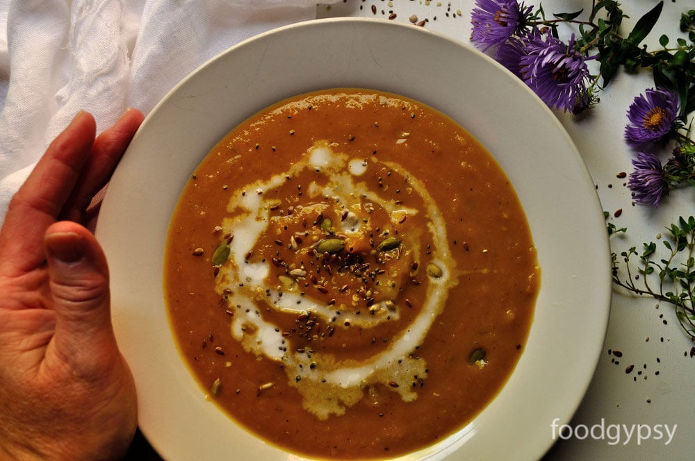 Spiced Winter Squash Soup was a menu time for a lovely wedding we catered in the early fall. It was a staff favourite. Rich with warm spices, creamy smooth, and deeply nutritious. It’s also dead easy to make, but it takes a bit of time.