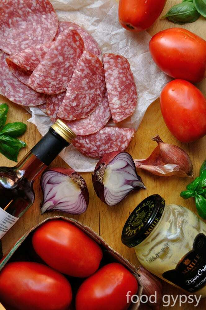 Flash forward 30 minutes when he places a (beautiful) plate of charcuterie, mixed with Roma tomatoes, olives, onion and fresh basil (from our garden) lightly dressed in a mustard vinaigrette in front of me… with a warm baguette on the side.