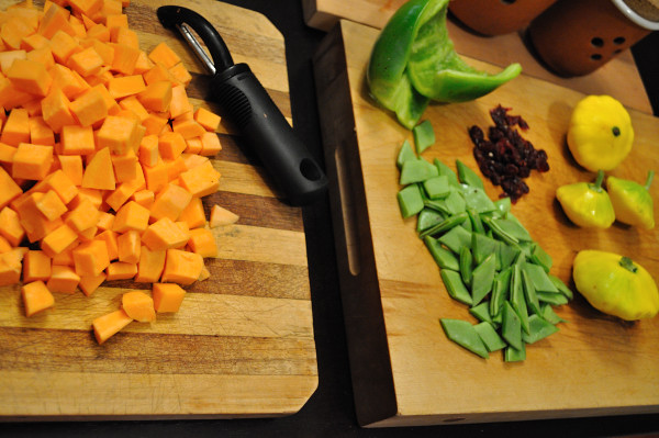 Here we start with roasted corn, then we roast everything else – green pepper, green onion, broad beans, a couple of patty pan squash and a big, juicy sweet potato. For added colour and chewiness, I tossed in some dried cranberries at the end, I just can’t get enough of those little beauties at the moment.
