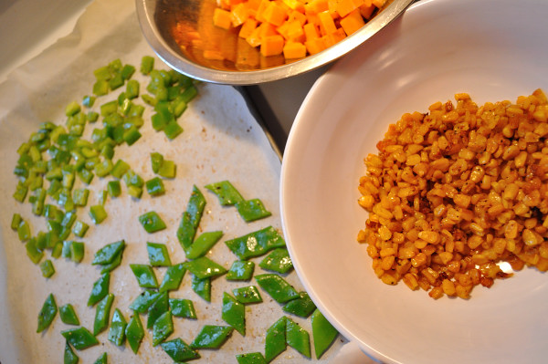 - Toss green pepper, green onion and squash with oil, place on same tray and roast in 400⁰F (205⁰C) oven until soft and browning on the edges, about 10 – 12 minutes. Remove from tray hot and mix with waiting roasted vegetables. Add dried cranberries.
