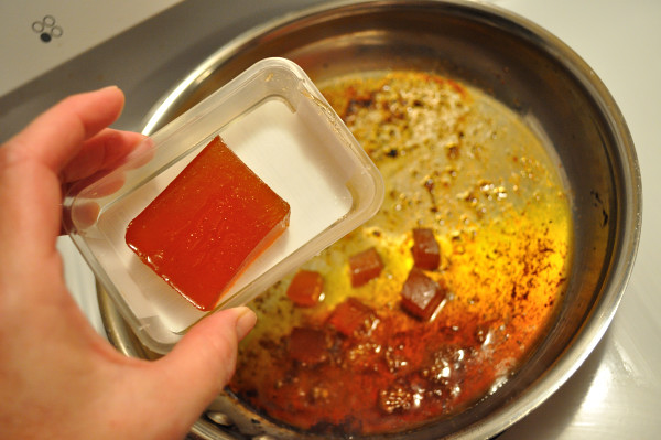 The pork chop is the fast, simple part of the meal, soaked in apple cider vinegar, seasoned and seared, finished in the oven, then glazed with the pan drippings and a couple of cubes of pear jelly we had in the fridge. A sweet, succulent accompaniment to a little (sufferin’) sweet potato succotash. You can easily substitute pear nectar (juice) for pear jelly, just reduce until thick and sticky.