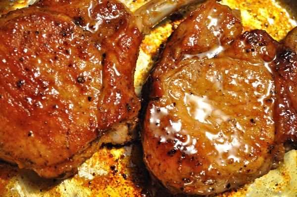 - ) When cooked to desired doneness, remove chops from the oven. Place pan back on the stove top on medium heat and remove chops to rest. Heat, scrapping suc from the bottom of the pan, adding a tablespoon or so of water if necessary, with a wooden spoon. Add pear jelly (or nectar) allow to melt/blend. Deduce as needed over low heat to form a sticky, thick glaze. Return chops to pan, and quickly coat with glaze until golden brown.