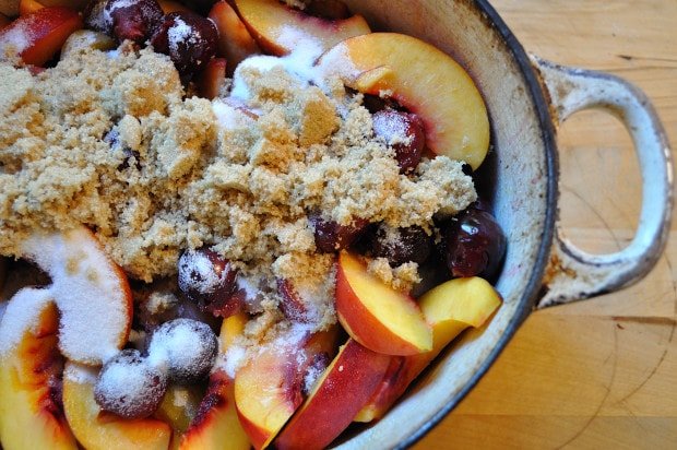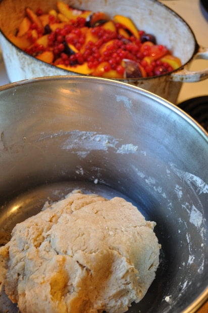 You can use whatever fruit you like for this cobbler, go with single fruit, like peaches, or mix it up for a harmony of flavour. I took a cruise through my local market and came back with about six pounds of fruit; nectarines, plumcots, three different kinds of plums and some beautiful cherries, dark and ripe. At the last minute, before topping the fruit with the biscuit dough, I tossed in some red currents that were lounging at the back of the fridge which lent a sharp twang to the syrupy juices.