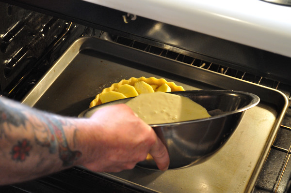 4. Place filled pie on a baking sheet, extend rack at the centre of the oven and place pie in the middle.  Fill prepared pie with custard to fill all gaps, pouring evenly over pie to coat apples.  Carefully slide oven rack back in the oven, close door and bake at 430* F for 5 – 7 minutes then REDUCE TEMPERATURE to 375*F and bake for 25 – 30 minutes or until custard is set and apples are cooked.