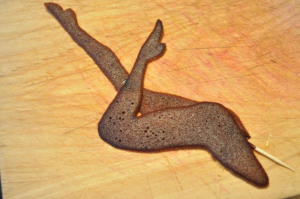 This element was the cause of much frustration, we baked several pairs of cookie legs; prepped the one you see above with a dab of chocolate to secure them to a toothpick, for shooting purposes.  We knew that the cookie would start to melt as it it came in contact with humidity and then droop, so we added the toothpick give me more time with the camera, plus another drop at the knee, to help keep them straight.