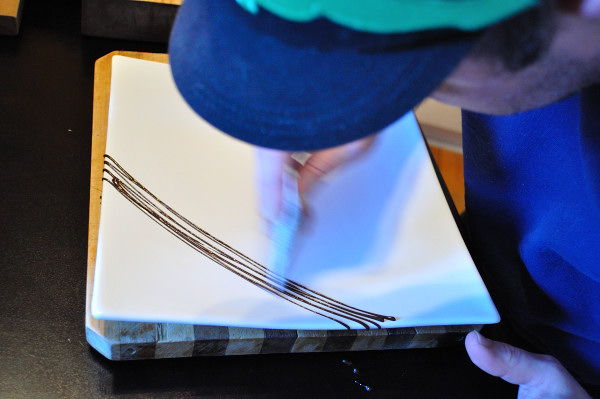 The silky chocolate drizzle,  is merely melted chocolate (in a parchment paper piping bag) applied directly to the plate.  Accents around the creme brulee; also tiny, well placed, drops of chocolate.
