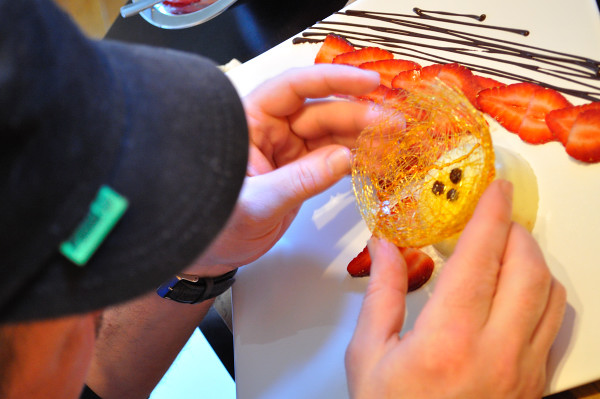 Chef B carefully constructs the final product. The three dark drops you see under the basket are also chocolate, to help hold it in place.