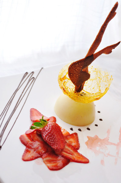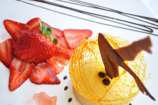 A little something interesting for Valentine’s Day with our Up Your Skirt Dessert; a reconstructed creme brulee, strawberry carpaccio, a dash of chocolate and a pair of edible gams.  What?  You were expecting cupcakes?!